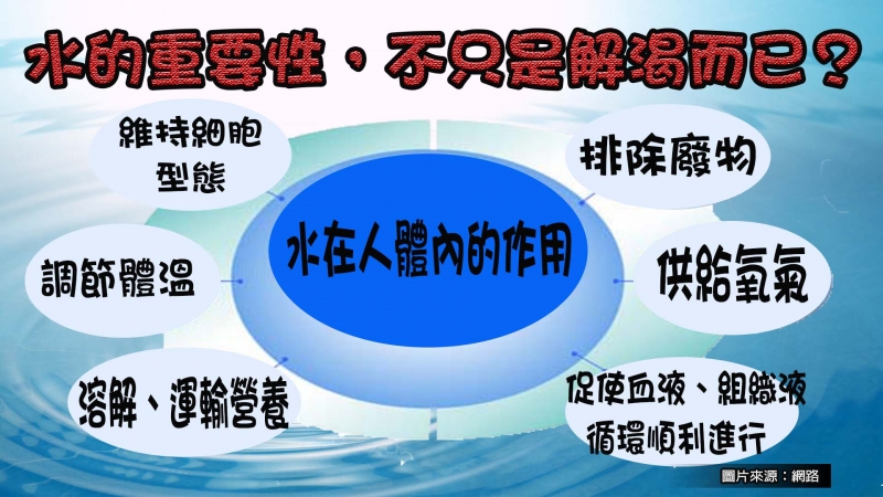 耳鼻喉科醫師柯仁弘表示,水是自然界最活耀的物質,重要性僅止於氧氣,人體各部組織大都是靠水來維持,光是水分就佔了60-70%比重。水的功能,從新陳代謝到食物消化、血液循環、呼吸系統順暢,乃至各器官運作、排泄、體溫調節、生育、授精過程…等。都和水息息相關,簡單來說,人體整個是泡在水中,所有人體運作都是泡在水中進行的。水能促進消化功能、增強新陳代謝外,還能解熱解酒、助眠醒腦鎮靜情緒,甚至能降低尿酸、預防痛風,喝水是簡單又不用花大錢的養身之道。