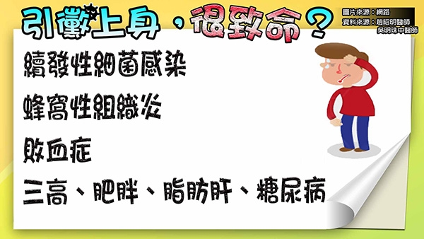 「黴」對健康會造成大問題,嚴重還會致命?趙昭明醫師提醒免疫功能較差的人,像是糖尿病患或是肝病病人,一旦細菌或是黴菌進入血液,就可能出現菌血症或是黴菌血症、或是跑到肺部造成肺炎、跑到腦部導致意識不清、跑到肝臟形成肝膿瘍、跑到骨頭出現骨髓炎等,均是後遺症大且難以控制的疾病。