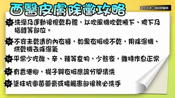 - 洗澡及運動後擦乾身體,以吹風機吹乾腋下、胯下及指縫等部位
