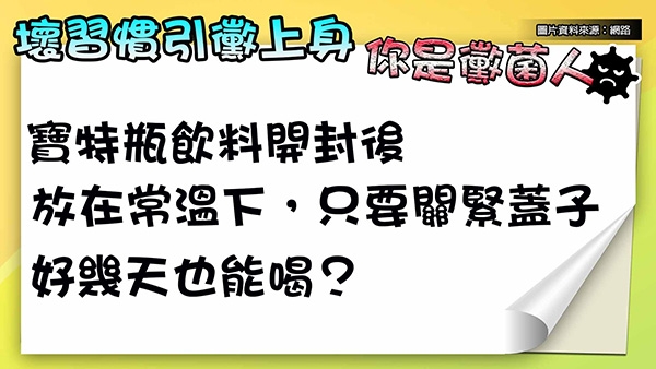 寶特瓶飲料開封後,放在常溫下,雖然關緊蓋子,但口水很營養,仍然會產生菌。