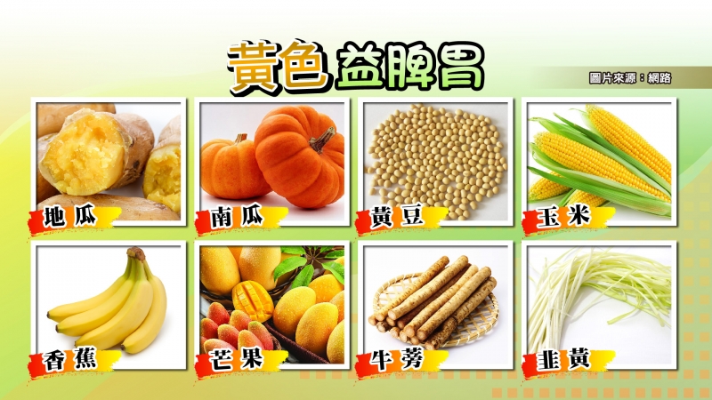 中國附醫內科醫療部主任蔡昆道表示,黃色食物包括地瓜、紅蘿蔔、南瓜、玉米、黃豆、黃色甜椒、香蕉、芒果、柚子、檸檬、木瓜、橙橘、柿子…五色養五臟,五色指青、紅、黃、白、黑五種顏色。《黃帝內經》中說:綠色養肝,紅色補心,黃色益脾胃,白色潤肺,黑色補腎。