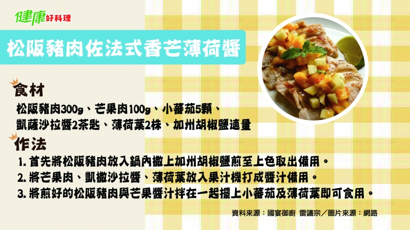 • 材料:松阪豬肉300g、芒果肉100g、小蕃茄5顆、凱薩沙拉醬2茶匙、薄荷葉2株、加州胡椒鹽適量。