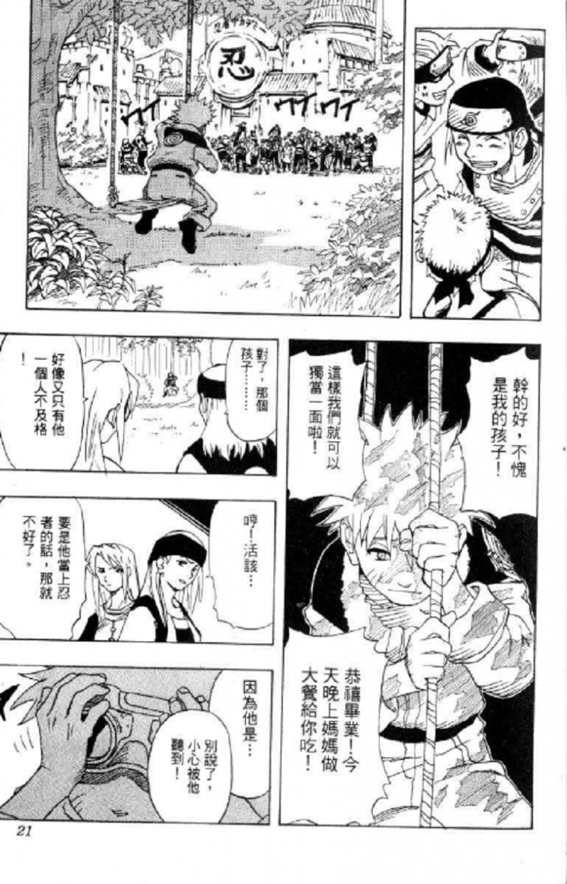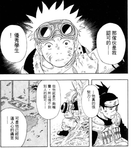 而在第一話裡,那些大人所耳語的「那個孩子」「要是他當上忍者就不好了」這些殘酷的話都傳進鳴人耳裡,而聽見的他只是戴上了護目鏡將臉遮起來。接著,下一格的畫面便是鳴人離開後的「沒有人在的鞦韆」。
