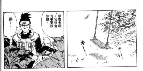 類似於這張「沒有人在的鞦韆」的圖曾經多次出現,在那隻中印象最深刻的是「鳴人vs我愛羅(第16集)」。鳴人認為曾經的自己與我愛羅的孤獨很相似,下一個畫面就是「流著眼淚的鳴人和我愛羅」。