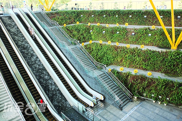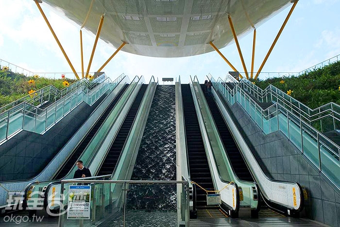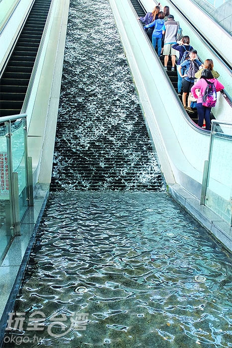 圖說:共有六道手扶梯與樓梯,手扶梯間夾帶一條長長的水道,使得設計上增添層次美感。/玩全台灣旅遊網特約記者阿辰攝