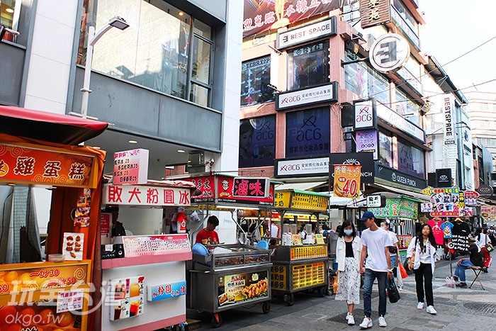 圖說:沿街兩側可見各式各樣的小吃攤家,聽聞許多創意特色美食都出自「新堀江商圈」喔。/玩全台灣旅遊網特約記者阿辰攝