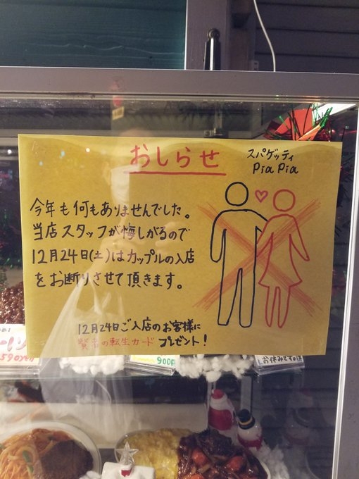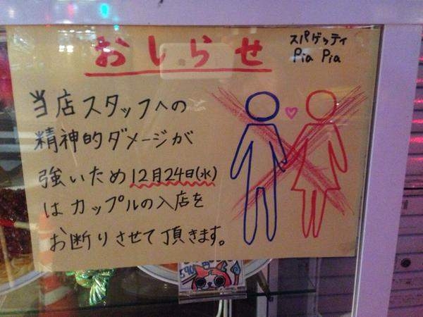 不過還好有老闆很貼心,聖誕節前夕就在門口上張貼告示「12月24日禁止情侶入店!」理由是為了保護員工免於強烈的精神衝擊XDDD