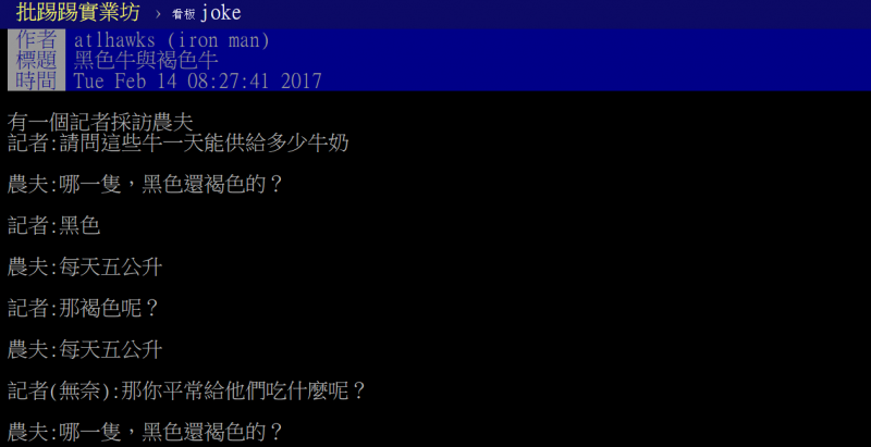這位記者想採訪農夫「請問你的牛一天能供給多少牛奶?」農夫卻問「你問褐色的還是黑色的?」