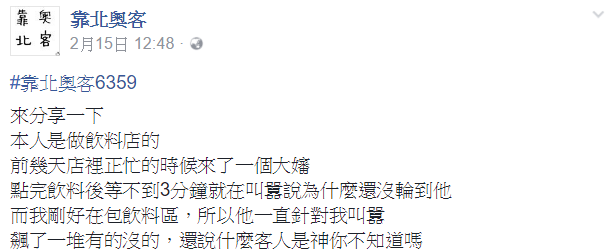 不知道大家有沒有打工做過服務業的經驗呢?很多人會遇到不可理喻的客人,覺得自己最高尚,所有人都應該把自己服侍的妥妥帖帖的...近日在靠北奧客就有網友貼文表示,他在飲料店打工時遇到一個奧客,甚至還嗆出一句奧客名言:「你難道不知道客人是神嗎?」