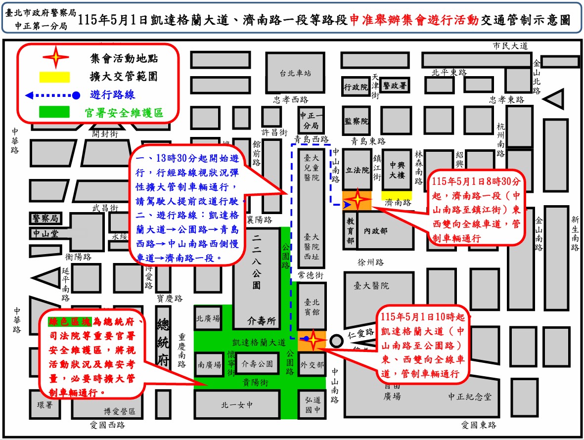 【民眾網編輯方笙楠臺北報導】臺北市中正區凱達格蘭大道、濟南路一段、襄陽路、中山南路等路段於115年5月1日(星期五)8時至18時,申准舉辦多場集會遊行活動。為維護前揭活動交通秩序與安全,中正第一分局業規劃交通疏導管制勤務,本次集會地點及遊行路線說明如下:一、「五一勞工