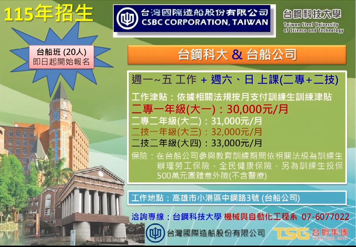 【記者王苡蘋╱高雄報導】產學合作成果再創亮點。台鋼科技大學攜手台灣國際造船股份有限公司(台船)推動的「台船專班」,近日傳出佳績,就讀二專一年級的蔡詠竣、陳韋翰與余東錦3名學生,在114年度下半年新進技術類人員甄試中表現亮眼,成功脫穎而出,於入學未滿一年即獲企業提前錄用為正式人力,展現技職