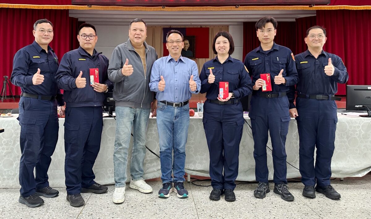 ▲警政署署長張榮興在副署長郭士傑、刑事警察局局長邱紹洲陪同下,今(4/15)日親赴竹市警察局第二分局,當面慰勉日前巡佐王聖文臨危不亂成功奪槍解救遭挾持人質一案的有功人員,同時並頒發慰問金。(竹市警察局提供)【焦點時報/記者羅蔚舟報導】日前(115年3月27日)民眾報案指稱轄內店家發生持槍鬧事情事