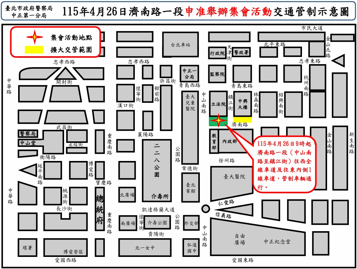 【民眾網編輯方笙楠臺北報導】臺北市中正區濟南路一段於115年4月26日(星期日)9時至15時,申准舉辦「抗議兒童托育服務法相關訴求」集會活動。為維護前揭活動交通秩序與安全,中正第一分局業規劃交通疏導管制勤務,本次集會地點管制情形如下:115年4月26日9時起,濟南路一