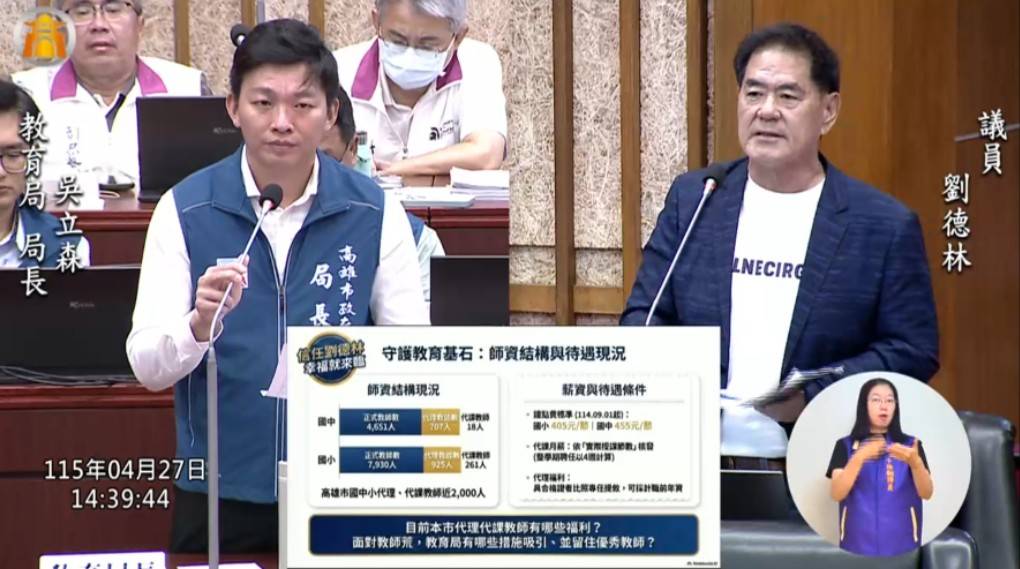 【記者王苡蘋/高雄報導】少子化趨勢下卻出現教師人力不足問題,高雄市議員劉德林27日於議會教育部門質詢時指出,現行代理、代課教師人數接近2,000人,顯示正式教師缺額仍未補足。他強調,要留住優秀師資,關鍵在於提升教師待遇與職業尊嚴,並呼籲教育局除持續釋出正式缺額外,也應鼓勵北漂教師返鄉任教