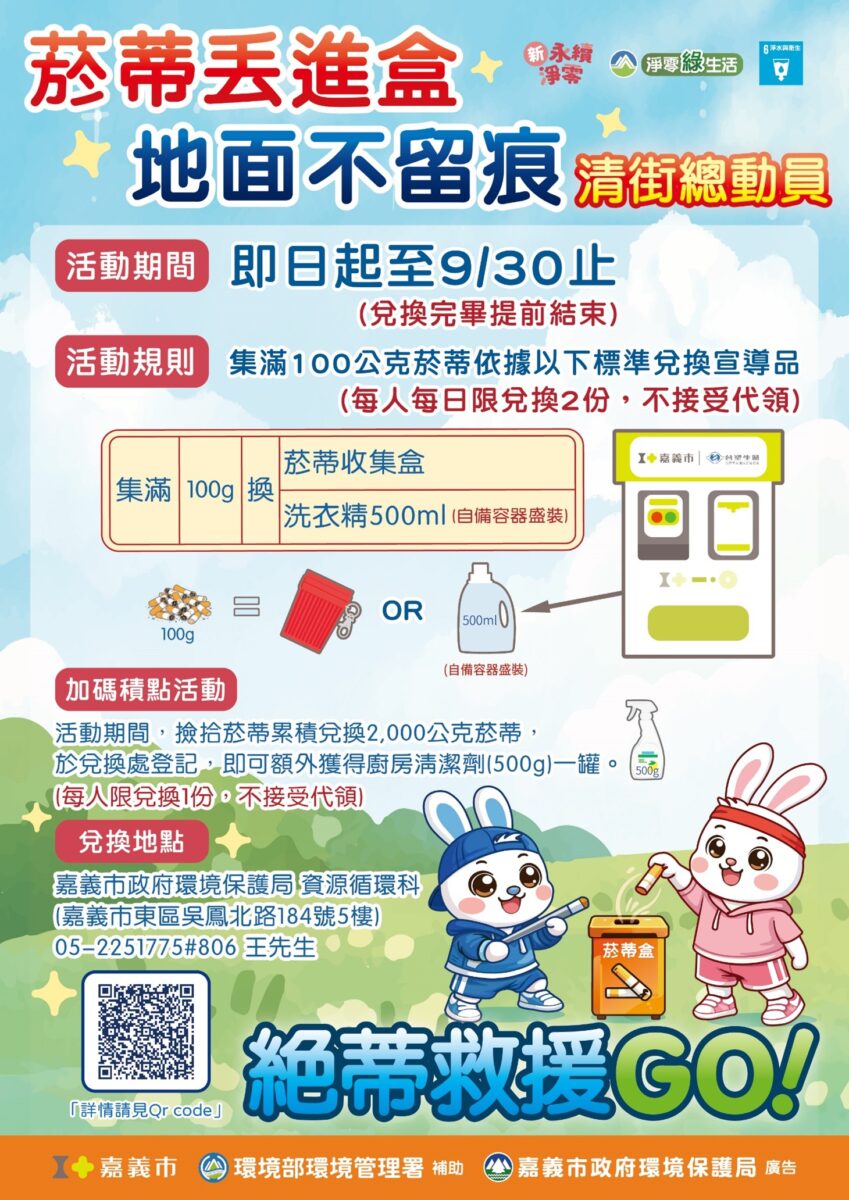 【記者劉芳妃/嘉義市報導】延續地球日環保行動,嘉義市政府環境保護局推出「撿菸蒂換好禮」活動,即日起至9月30日止,民眾每收集100公克菸蒂可兌換精美的菸蒂收集盒或台塑洗衣精500毫升(需自備容器盛裝);累積滿2,000公克,還可再獲得廚房清潔劑1瓶。數量有限,換完為止,活動詳情請至該局臉
