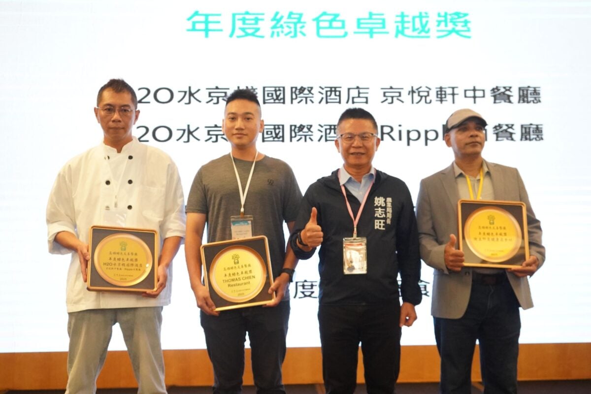 響應世界地球日,高雄市政府農業局22日舉辦「2026年高雄綠色友善餐廳(餐盒)評鑑成果發表會暨食材媒合活動」,公布年度評鑑名單,並透過產地與餐桌的直接對接,展現高雄推動綠色飲食與永續農業的具體成果。↑圖說:農業局長姚志旺(右2)頒發本屆最高榮譽「年度綠色卓越獎」,由H2O水京棧國際酒