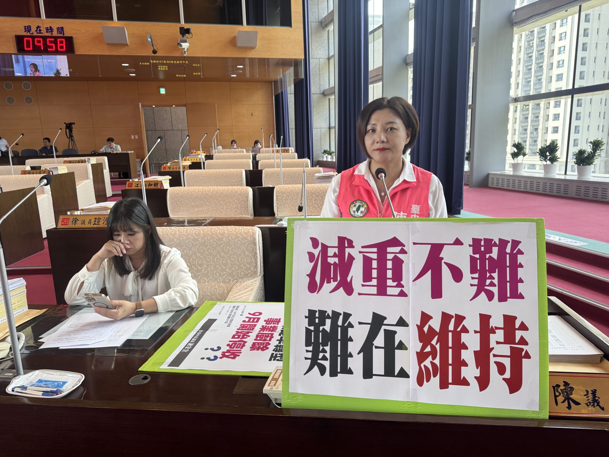 【民眾網諸葛志一臺中報導】市議員陳雅惠關心市民減重與健康體位政策。28日在議會質詢指出,台中過重及肥胖比率已由112年42.9%降至113年38.4%,並在114年持續維持,顯示方向正確,但現行政策仍偏重短期活動,缺乏長期追蹤與健康管理機制,亟待檢討精進。陳雅惠表示,依市府資料,參