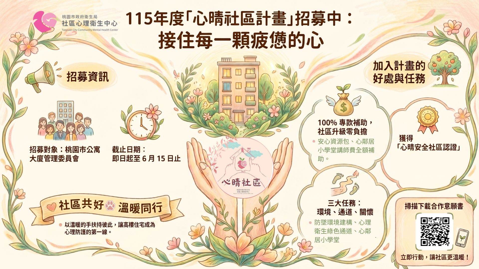桃園市政府衛生局於114年首度推動「心晴社區計畫」,邀集16個社區參與,成功將心理健康促進與自殺防治觀念融入社區日常。圖:衛生局提供因應都市化發展下高密度居住所帶來的人際疏離與心理健康挑戰,桃園市政府衛生局於114年首度推動「心晴社區計畫」,邀集16個社區參與,