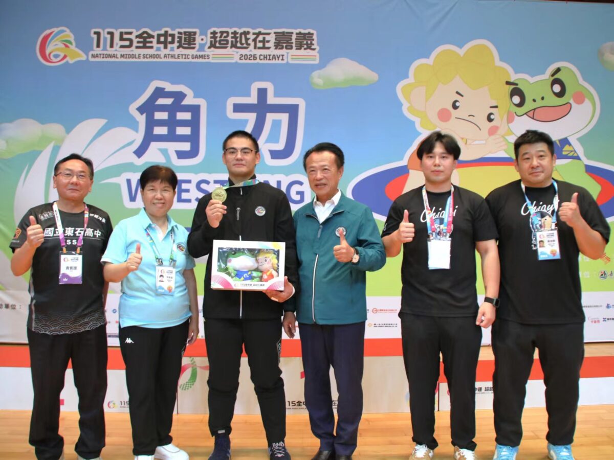 【記者吳瑞興/嘉義縣報導】115年全國中等學校運動會角力賽事於吳鳳科技大學旭光中心展開。地主嘉義縣代表隊首日即有斬獲,由東石高中選手莊宇僑在高男組希羅式第十級奪金,拿下本屆賽會嘉義隊首面金牌,同日累計取得1金、1銀、5銅的成績。高男組希羅式第十級決賽中,莊宇僑展現穩定