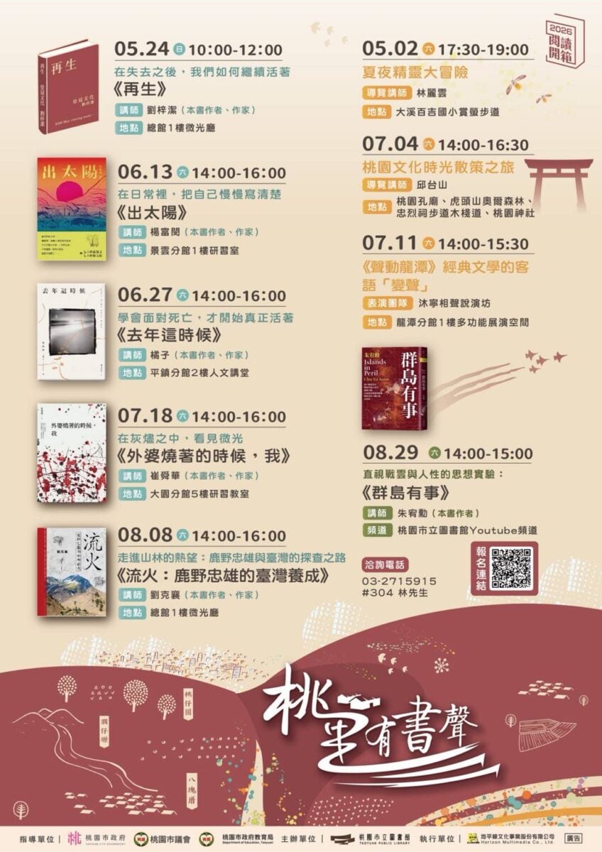 【記者劉蘇梅/桃園報導】桃園市立圖書館2026年閱讀開箱上季「桃里有書聲」,將於5月2日至8月29日登場,推出共9場活動,涵蓋5場講座與新書分享、3場特別企畫及1場數位閱讀,從夜間生態、城市走讀到聲音表演,打造一場橫跨場域與感官的閱讀行動。⁰本季以「生活經驗與在地感受