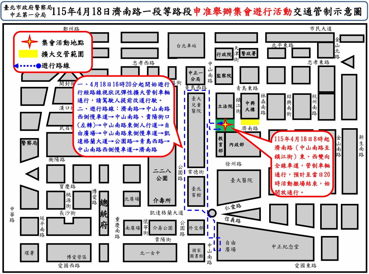 【民眾網編輯方笙楠臺北報導】臺北市中正區濟南路一段、中山南路、公園路等路段於115年4月18日(星期六)8時至22時,申准舉辦「大麻除罪化」集會遊行活動。為維護前揭活動交通秩序與安全,中正第一分局業規劃交通疏導管制勤務,本次集會地點及遊行路線說明如下:一、集會地點: