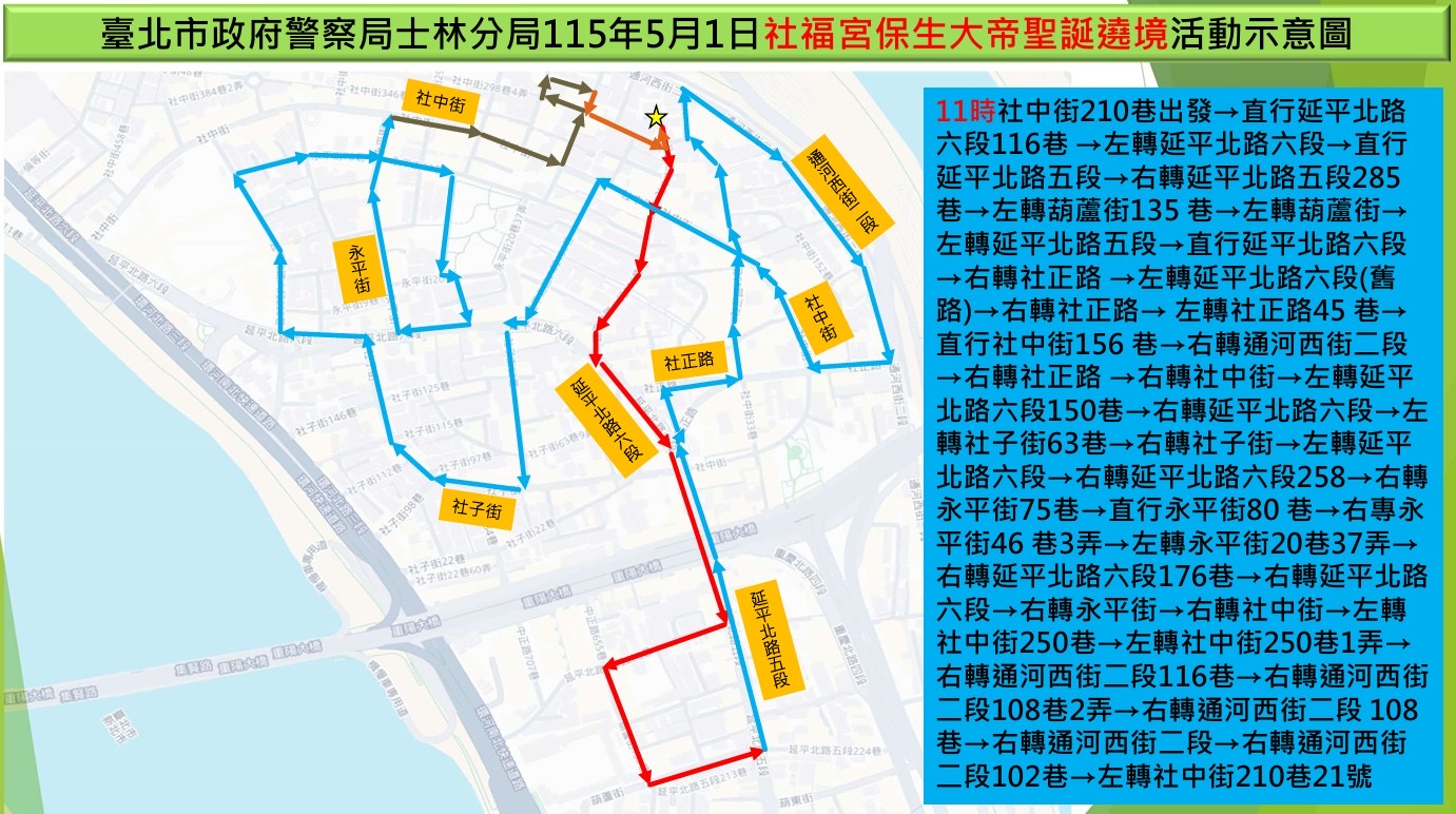 【民眾網編輯方笙楠臺北報導】臺北市政府警察局士林分局轄內社福宮、社子天后宮預計於115年5月1日(五)、5月2日(六)舉辦遶境活動,虔誠信眾將湧入參拜並隨保生大帝、媽祖遶境,遶境區域除葫蘆堵外,並進入社子、三角埔及渡仔頭等地區,遶境活動適逢連續假期,勢將對葫蘆堵及社子地區交通造成部分