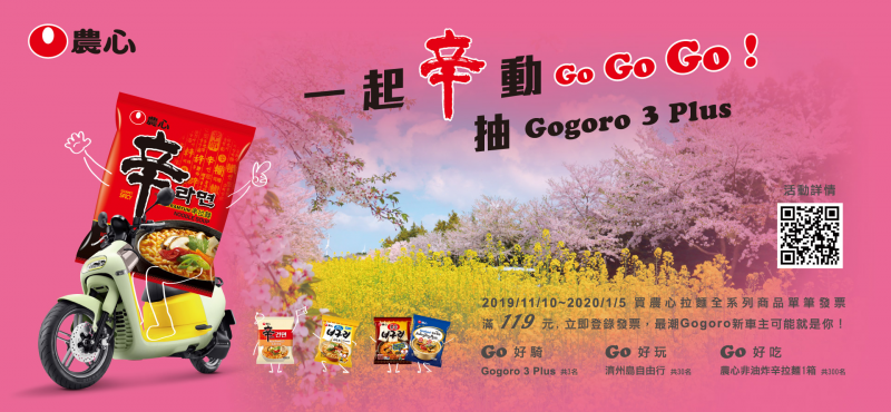 除了多樣的口味,為了回饋廣大粉絲長期以來的支持,農心更加碼推出「一起辛動GOGOGO!」抽獎活動,即日起至2020年1月5日,只要購買農心拉麵全系列單筆消費滿$119(含)以上,前往活動網站完成登錄發票,就有機會抽大獎,總獎項價值超過100萬,中獎名額更多達333名,贈送獎項包含時下最夯的「Gogoro 3 Plus (共3 名),韓國知名景點旅遊勝地「濟州島自由行」(共30 名) ,以及農心非油炸辛拉麵1 箱(共300 名),登錄發票越多,中獎機會就越大,現在就快和親朋好友宣傳這個好康,一起揪團買農心泡麵再搶抽超心動的獎項。