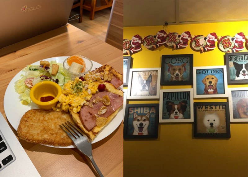 黃藍相間的店門上貼著一張「內有柯基出沒」的可愛告示牌,相信還沒進門就猜到這家咖啡廳藏了什麼可愛萌物了吧?座落於北投捷運站旁巷弄裡的《拖鞋咖啡》是間溫馨可愛的小店,環境乾淨舒適,牆上還有許多療癒的狗狗畫框,菜單選擇也十分多樣,早午餐、墨西哥捲餅及義大利麵任君挑選,其中儂編最愛的是他們的早午餐,厚實的薯餅和法式吐司令人口水直流,可別看它小小一盤,其實份量超~大,每次吃完都極飽,撐一個下午不是問題!