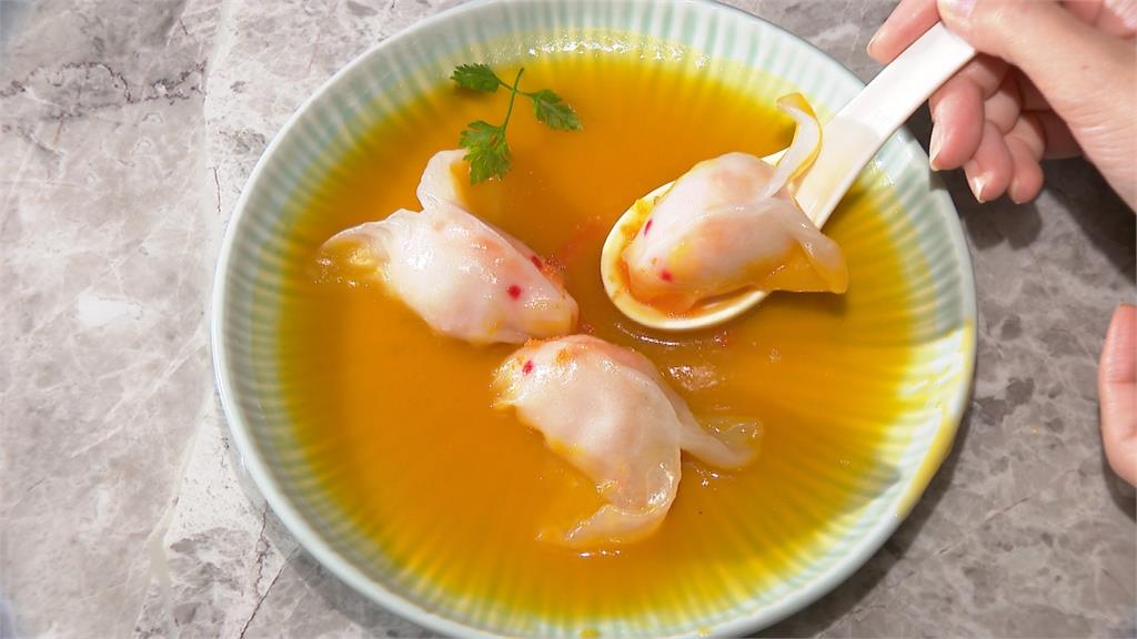 一隻隻金魚彷彿悠遊水中,其實這是金魚餃,每一隻都要手捏,看來唯妙唯肖,打開來吃得到蝦子、花枝的鮮味。蝦卵讓金魚看來白裡透紅,鮮味爬上舌尖,黃燜湯融合南瓜、蝦湯增添鮮味。師傅兩隻大手,把澄粉揉軟捏成小塊。