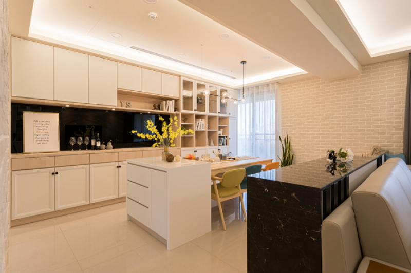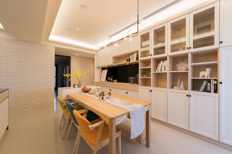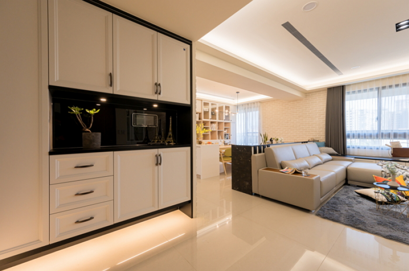 2.餐廳區系統收納展示櫃特別明亮簡潔,採用歐德系統傢俱量身訂製,以白色櫃體為主或採開放式,或穿插玻璃門片,黑色烤漆玻璃中腰背板放大空間,同時對應玄關櫃的風格一致性。