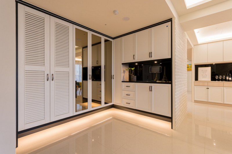 ▲玄關以優雅氣質的百葉鏡面櫃體迎賓,系統衣鞋櫃以底部懸空打燈的效果,減低大量櫃體厚重感,置物櫃中腰鏤空的黑色烤漆玻璃除了放大空間感,也呼應櫃體黑色鑲邊的時尚感。