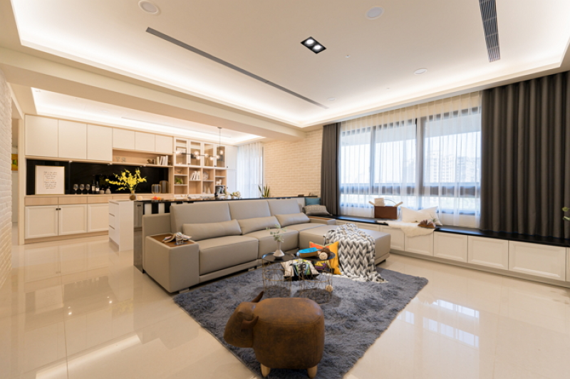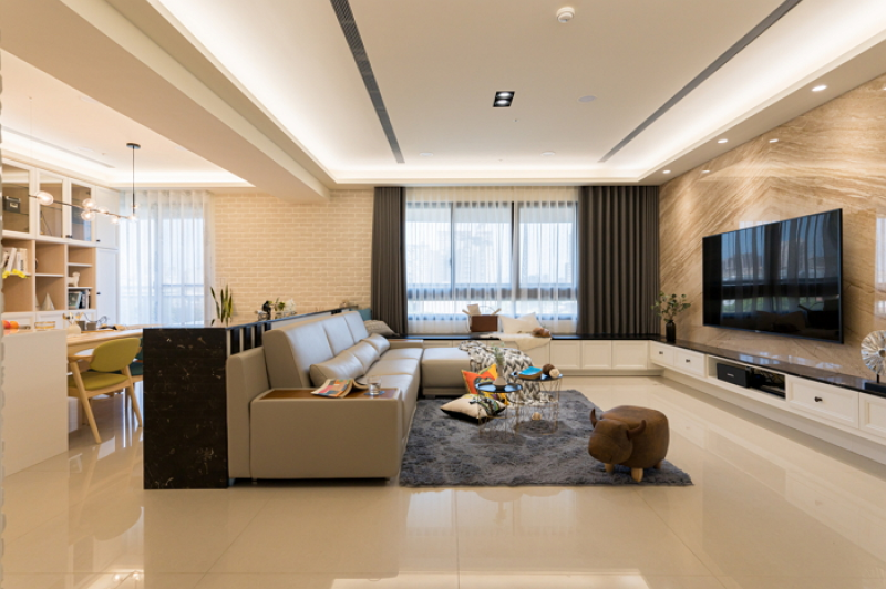 2.客廳區以大器為主氛圍,蒂洛大理石雕砌出電視牆的磅礡氣勢,黑金剛大理石為頂座的白色電視低櫃L型延伸變換為窗台邊座榻,簡潔規畫場域收納功能性。