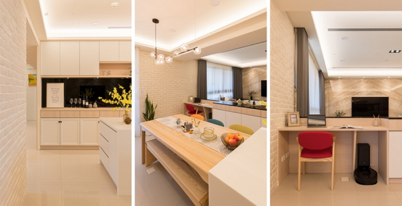 1.餐廳區以人造石中島延伸優渥實木哥本哈根系列餐桌椅,將圓潤、安全、親切感的風格融入空間氛圍,而因應全家人的作息,餐廳區實則為一多功能區,除了用餐之外,也是男主人工作、小孩寫功課,以及親子共讀互動園地。