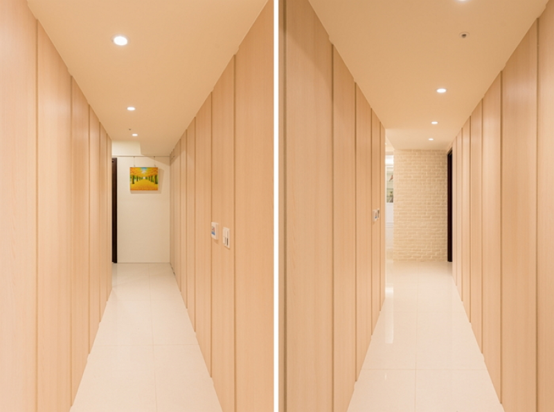 1.進入臥室區廊道別具風格,兩側以歐德系統板材深溝縫造型做簡約有型的立體面設計,其中主臥室的隱藏門即掩於廊道盡端,同時也避掉房門對浴廁門的風水之忌。