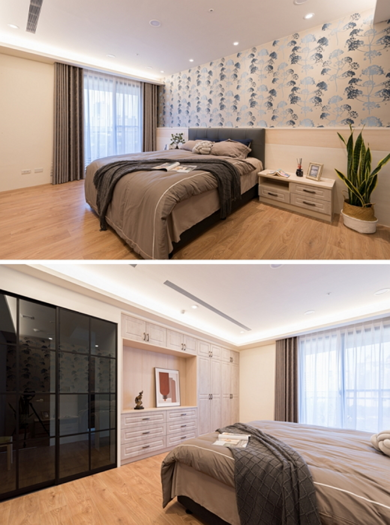2.主臥室結合鄉村與現代風格,床頭櫃採簡約木紋色系,上部牆面以藍暈壁紙做大膽點綴。床尾以鄉村風木紋色系做為大型衣櫃收納。