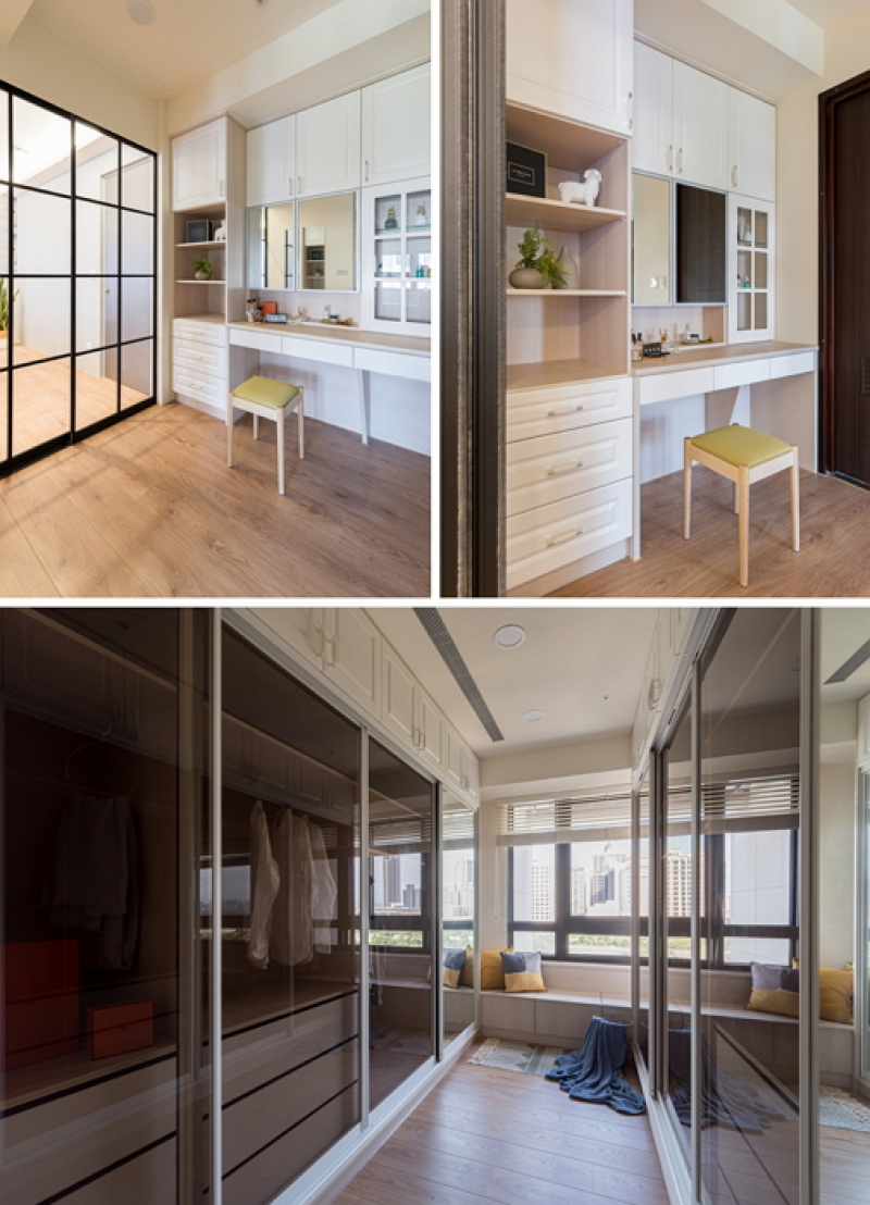 3.玻璃拉門進去為更衣天地,化妝桌之外,兩側設置大型衣櫃,為女主人打造海量的衣物收納規畫。