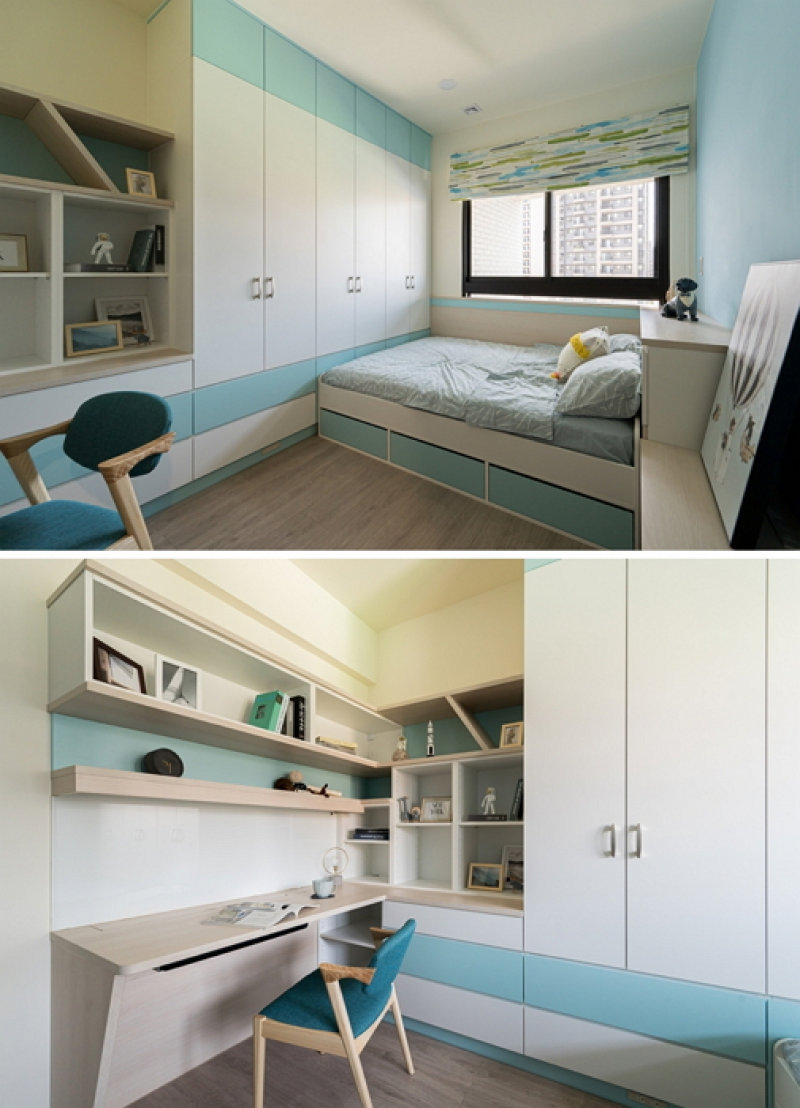1.男孩臥房以現代風格藍白的活潑色調襯托出陽光男孩的剛毅氣質,書架、衣櫃、床架,歐德設計師滴水不漏將每一方寸的收納功能規劃的淋漓盡致。