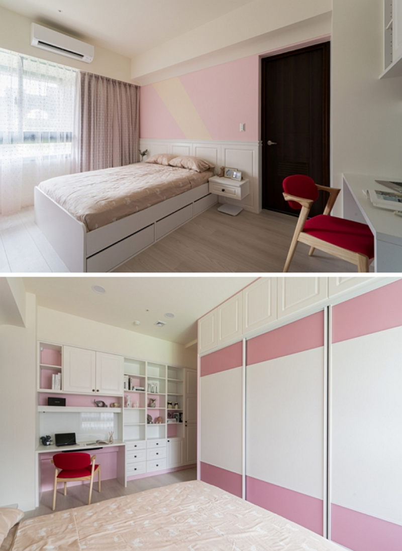 2.女孩閨房以新古典粉紅穿插白色系統傢俱營造夢幻氣息,並以大量收納為主要訴求,床下大抽屜和頂天立地大型衣櫃,足以應付從小女孩蛻變為小女人的成長需求。