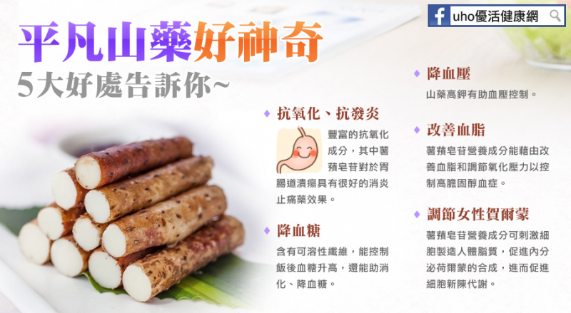4.降血壓血脂:山藥富含鉀離子,能夠排除體內多餘鹽分,有助於血壓控制。黏性的食物纖維可以減緩體內糖分的吸收,鎂、鋅以及維生素B1可促進葡萄糖代謝,幫助胰島素作用,抑制飯後血糖飆高。研究結果指出部分山藥成分被發現到能夠有效降低血壓。生山藥能經由抑制VLDL的釋放來降低膽固醇,能降低血脂,研究結果指出,薯蕷皂苷(diosgenin)為相當有效的成分,能藉由改善血脂和調節氧化壓力以控制高膽固醇血症。