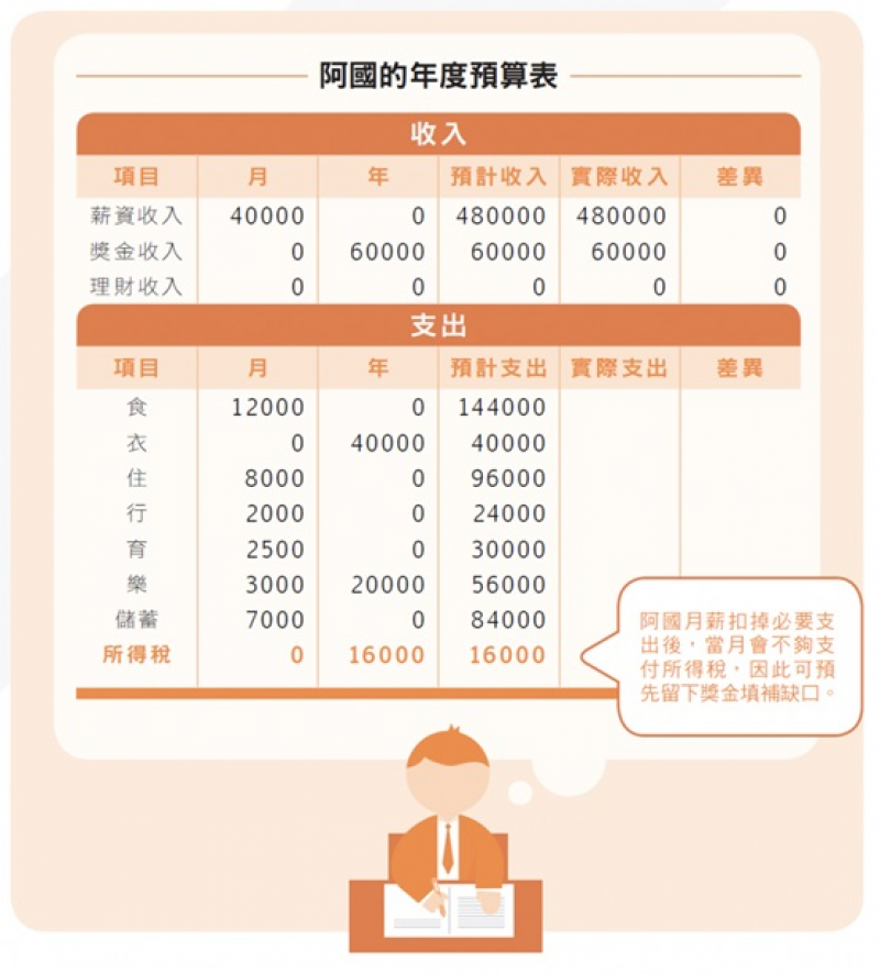 認證理財規畫顧問(CFP)徐采蘩認為,獎金收入不容易留下來,是因為不知道有哪些更需要資金的時刻,或忽視綜合所得稅這類型隱藏支出。要解決這個問題,就是每年都製作一張預算表,把關資金流向。