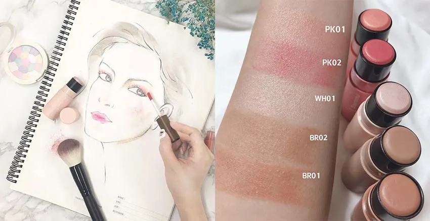 適合所有膚質的奶油質地,富含保濕精華、就像精華棒一樣,上臉後充滿水分,腮紅的部分也可以增加蘋果肌的澎潤感,整天都可以有滋養的效果,打亮比較偏冷色調,可服貼臉部的凹凸,達到光滑又細緻的水光效果。
