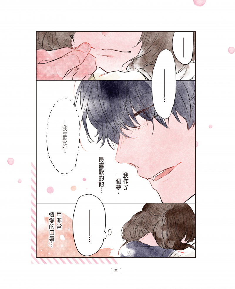 其中,少女被暗戀對象摸了頭髮後,開心之餘卻產生「這樣輕易摸頭的溫柔,也會對其他人做嗎」的不安,百分百描繪了戀愛中少女的慌亂,讓人讀來頗為玩味。《深埋心底的情感,只想告訴你》中文版附贈佈滿櫻花的表白明信片,為精靈少年表達說不出的喜歡。