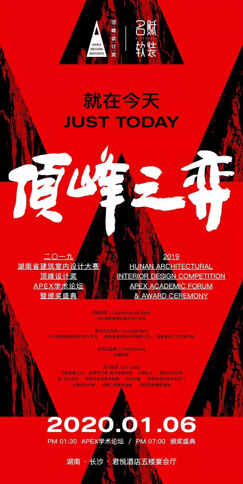 2020年1月6日由中國建築學會室內設計分會(IID-ASC)學術支持,HIID湖南省建築室內設計學會發起,聯合湖南省設計藝術家協會、湖南省建築設計院有限公司主辦的「APEX學術論壇」在長沙君悅酒店隆重開幕!各地行業大咖及新浪網、紅網、騰訊大湘網等數十家知名媒體,皆共同出席了本次的論壇,近千名湖南設計精英也都紛紛參會,現場座無虛席,共享這一年一度的設計論壇盛會!