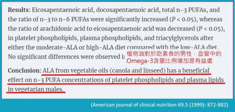 研究團隊收納了17名男性素食者,讓他們在前14天食用含低ALA的飲食,然後完成14天的飲食後,接著再食用28天中度或是高度ALA的飲食,分別記錄地0天、14天與42天的血液變化,發現血液中的EPA、DHA與總Omega-3比例都有顯著上升,然後會引起發炎的物質花生四烯酸含量比例下降。因此,植物油(菜籽油、亞麻仁油)中的ALA對於男性素食者,血液中Omega-3不飽和脂肪酸比例上升是有益處。