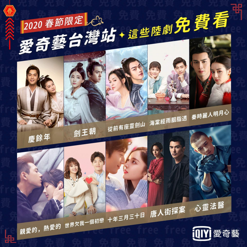 2020年「金鼠」春節假期將至,愛奇藝台灣站即日起至2/2推出「限時免費追劇馬拉松」福利大放送,讓劇迷可在春節期間加入免費追劇馬拉松!「鼠」不盡的熱門陸劇包含由張若昀、陳道明、肖戰等人出演最夯古裝大劇《慶餘年》;「現男友」李現爆紅神作《親愛的,熱愛的》、《劍王朝》;許凱、張榕容「56CP不能亡」的爆笑神劇《從前有座靈劍山》;又甜又虐的愛情劇《世界欠我一個初戀》、《十年三月三十日》。