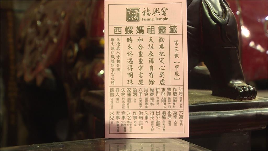 在雲林西螺福興宮第一支國運籤,媽祖就陷入長考,連抽了13支籤都無法連續三聖筊,廟方還換了抽籤人員又連續抽了14支籤,終於抽到第3籤「甲辰」,由福興宮董事長楊文鐘連續擲出三聖筊確認,現場信眾一片歡呼。