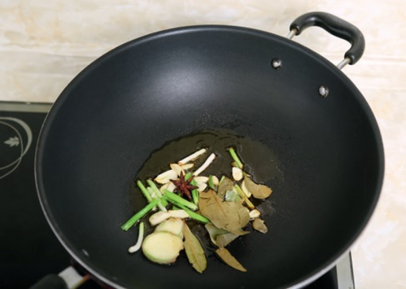 3 熱鍋後加入油,再放入薑片、蒜頭、蔥段爆出香味,放入八角、月桂葉。