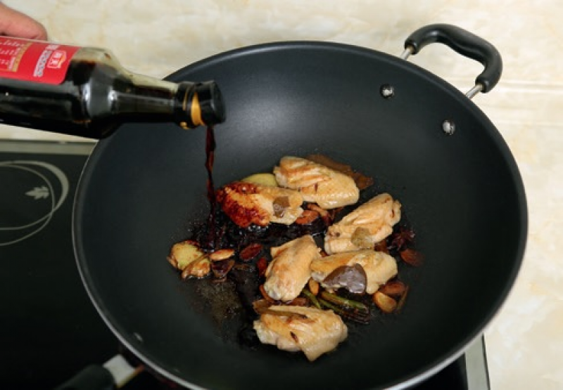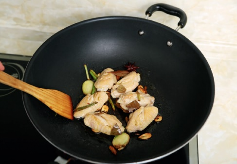 4 放入雞翅,炒至表面緊縮上色。