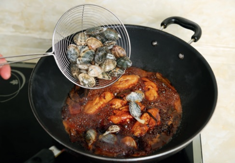 6 待雞翅煮至能輕鬆插入筷子,再放入蛤蜊煮至開口,最後以大火收汁。