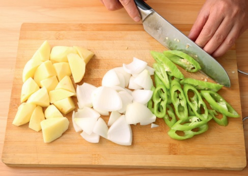 2 馬鈴薯削皮、洗淨,切成塊;洋蔥去皮,切成塊;青辣椒洗淨,斜切成圈。